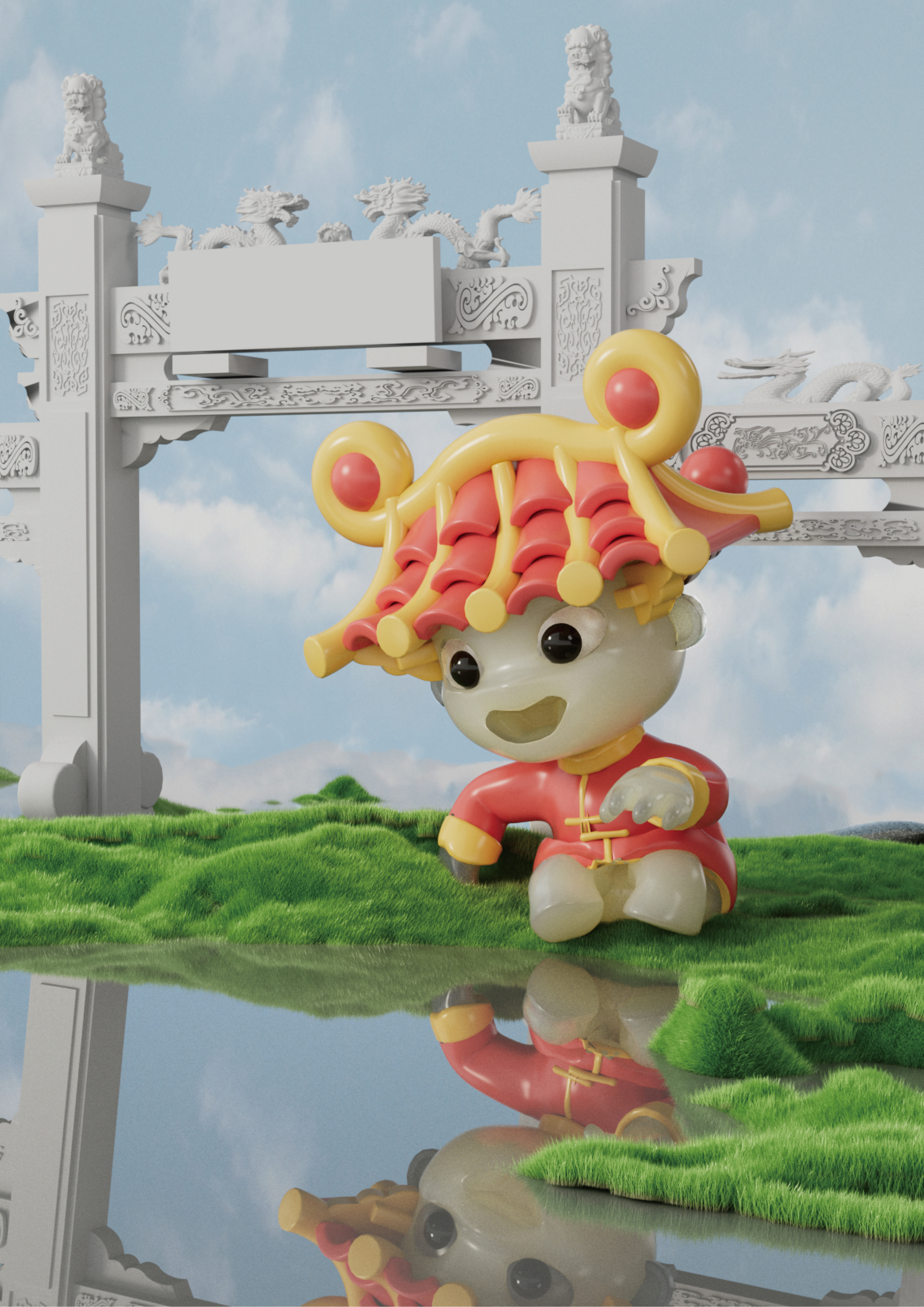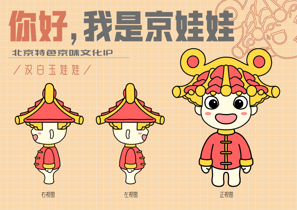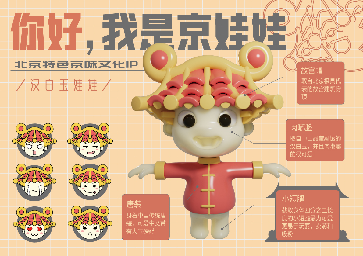 京娃娃是文化古都北京故宫孕育出的小小“京精灵”。其头顶是故宫最具代表性的房顶建筑,彰显特色北京、大气故宫,吸引游客以及北京文化爱好者。肉嘟嘟的小脸晶莹剔透,因为其材料是中国古代汉白玉,可爱也更能代表其纯洁高尚的品质。四分之三的小短腿是最可爱最Q最能吸粉的小腿哦。一身唐装既代表着渼陂也代表着中国,大气又磅礴。